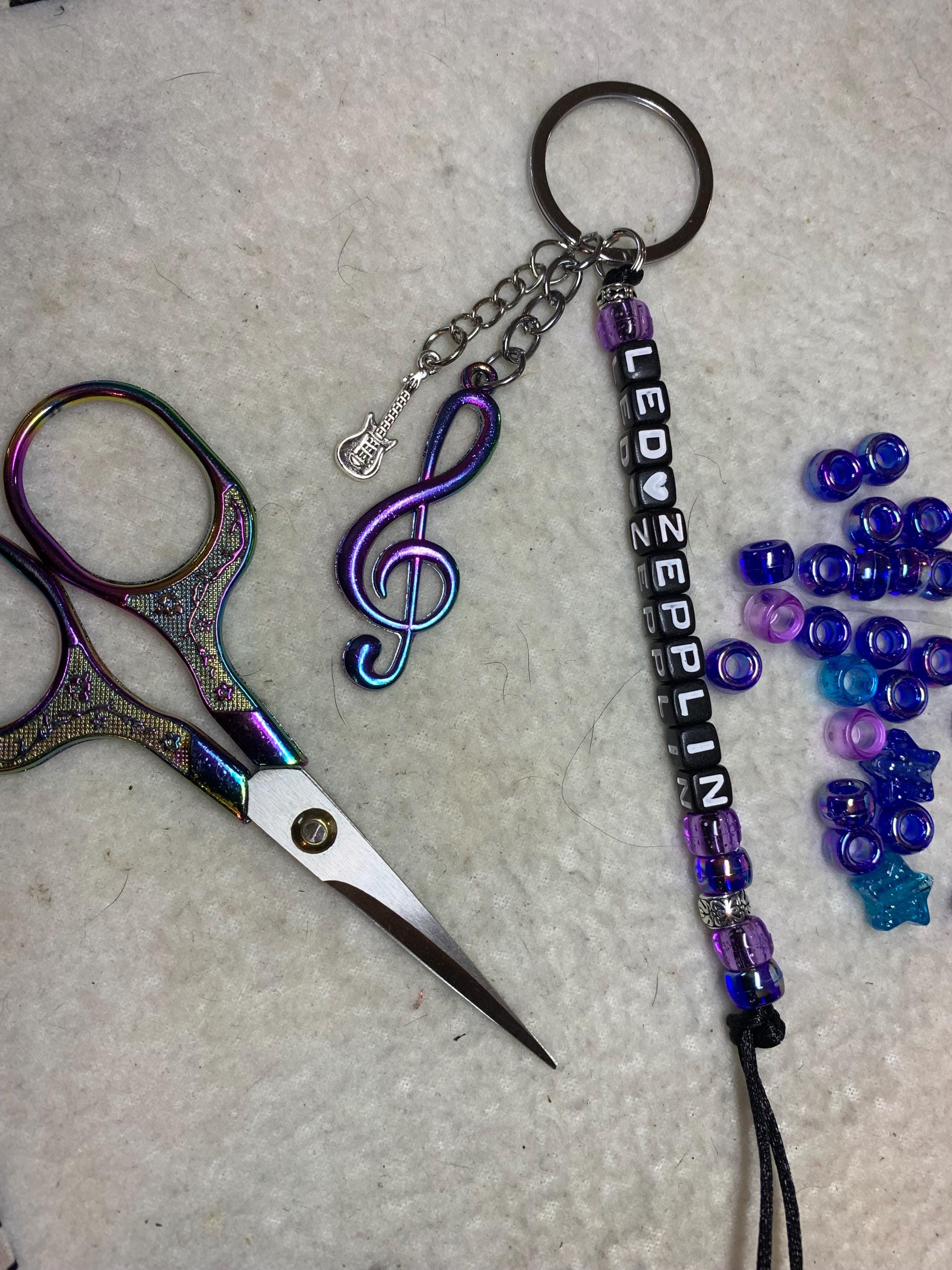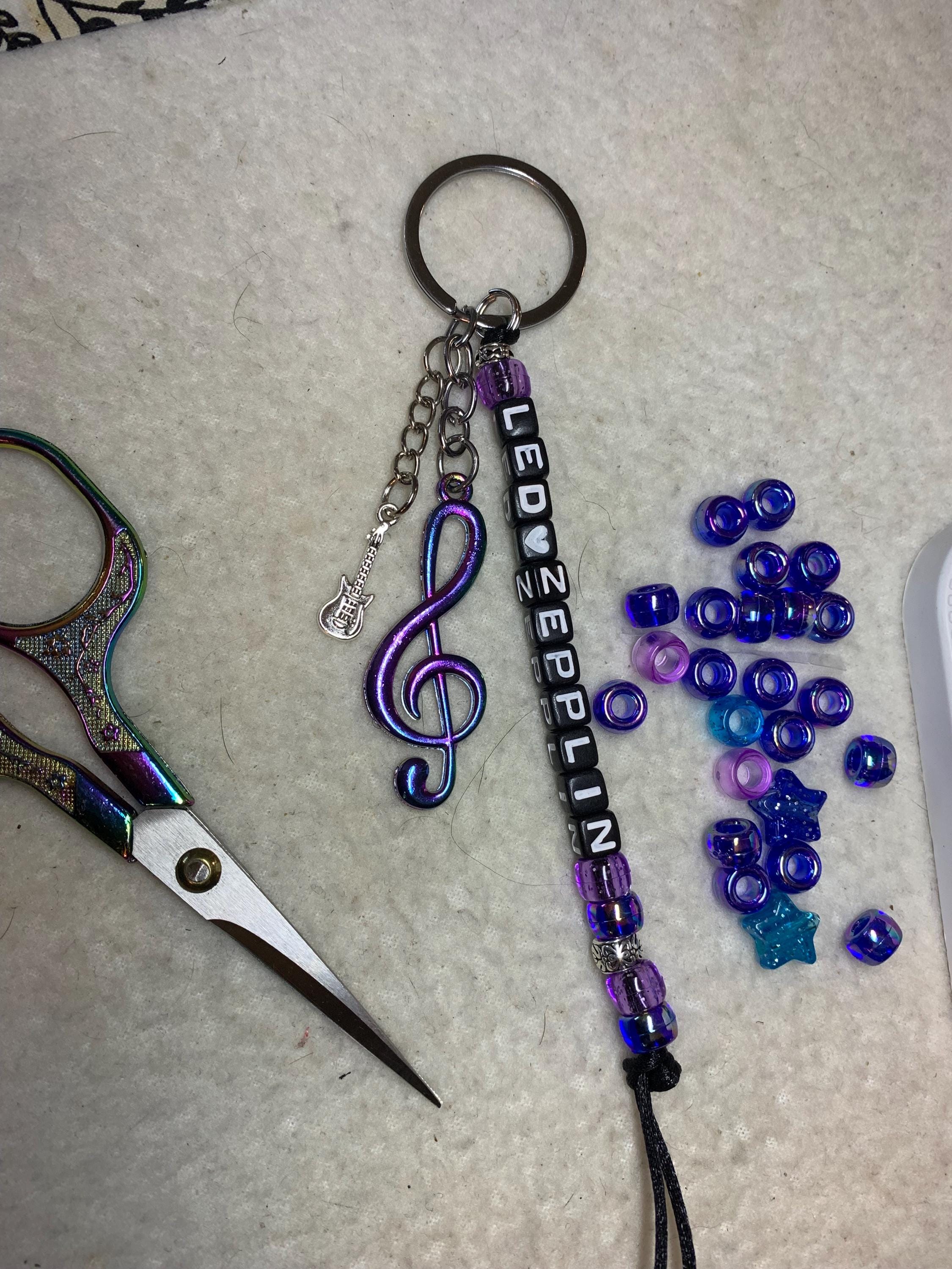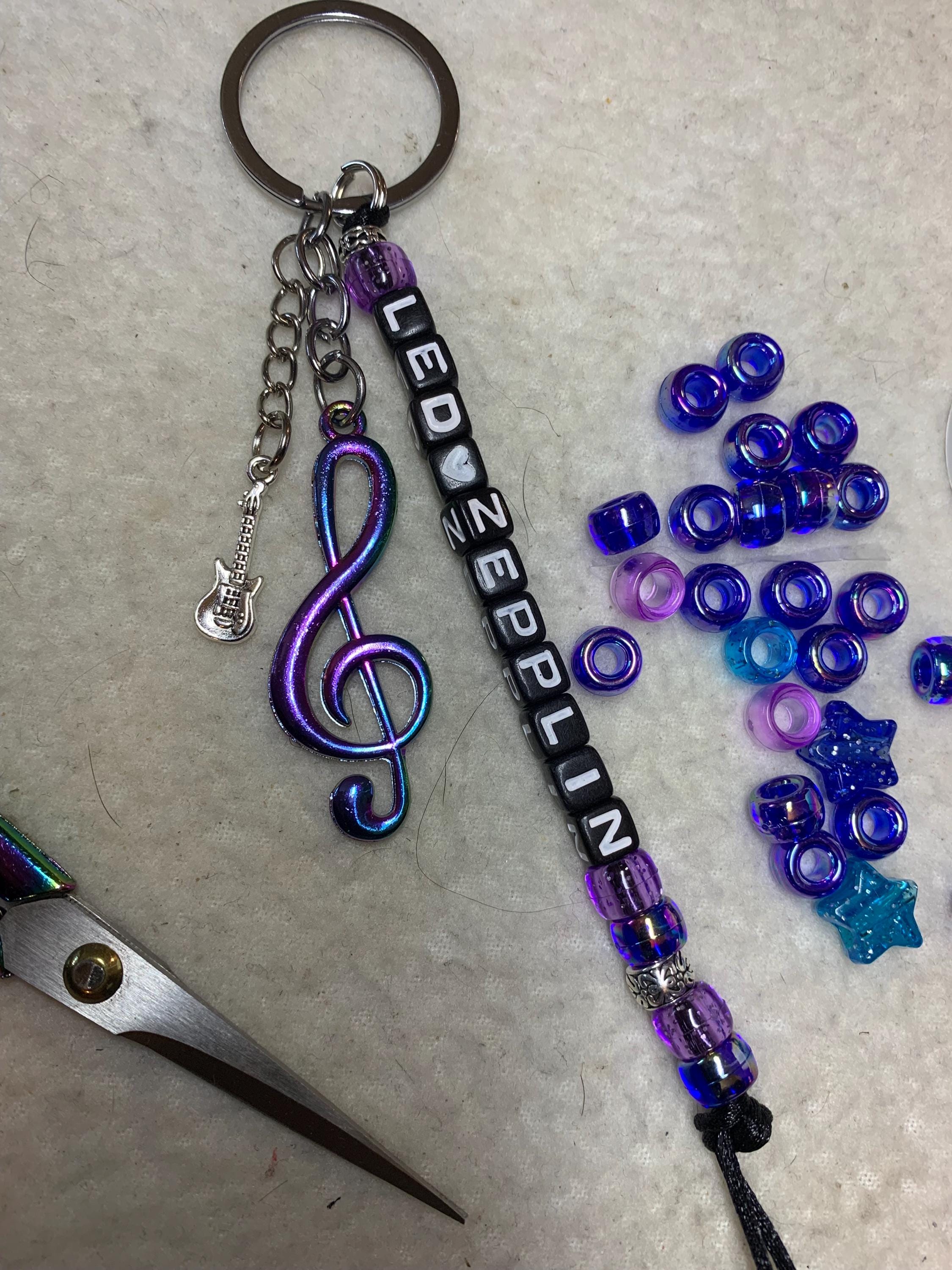 Keychain split ring with metal embellishments including a large rainbow treble clef musical note & acrylic lettering on nylon “rat tail” cording. Purple pony beads with silver spacers. Sent to you in a holiday organza bag for one stop shopping from RockerGirlDesigns!!!
